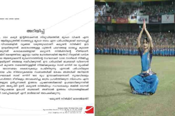 കലൂർ സ്റ്റേഡിയത്തിൽ ഗിന്നസ് റെക്കോർഡ് ലക്ഷ്യമിട്ട് മൃദംഗമിഷൻ്റെ നേതൃത്വത്തിൽ സംഘടിപ്പിച്ച ‘മൃദംഗനാദം’ മെഗാ നൃത്ത പരിപാടിയിൽ ഉയർന്ന വിവാദങ്ങളിൽ വ്യക്തത വരുത്തി കല്യാൺ സിൽക്സ്. സംഘാടകരുമായി നടന്നത്…