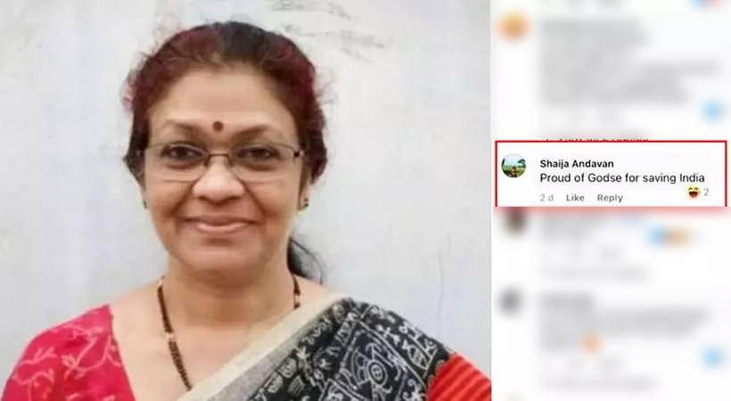 ഗോഡ്സെ ഇന്ത്യയെ രക്ഷിച്ചതിൽ അഭിമാനമെന്നാണ് ഷൈജ ആണ്ടവൻ കമന്റിട്ടത്. മഹാത്മാഗാന്ധിയുടെ രക്തസാക്ഷിദിനത്തിൽ കൃഷ്ണരാജ് എന്ന പ്രൊഫൈലിൽനിന്ന് പോസ്റ്റ് ചെയ്ത ഗോഡ്സെയുടെ ചിത്രത്തിനു താഴെയായിരുന്നു കമന്റ്. ഗോഡ്സെയെ പ്രകീർത്തിച്ചതിൽ ഉറച്ചുനിന്ന അധ്യാപിക പ്രതിഷേധം ശക്തമായപ്പോൾ കമന്റ് പിൻവലിക്കുകയായിരുന്നു. കലാപ ആഹ്വാനത്തിന് ഇവർക്കെതിരെ കേസെടുത്തിരുന്നു.