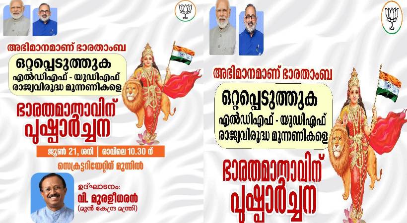 കാവിക്കൊടിക്ക് പകരം ത്രിവർണ പതാകയുടെ ചിത്രവുമായി ബിജെപി. സെക്രട്ടറിയേറ്റിന് മുന്നിൽ ഇന്ന് നടക്കാനിരിക്കുന്ന സമരപരിപാടിക്കായി തയ്യാറാക്കിയ പോസ്റ്ററിൽ കാവിക്കൊടി മാറ്റിയ ഭാരതാംബയുടെ ചിത്രമാണ് ഉൾപ്പെടുത്തിയത്. ചിത്രം പങ്കുവെച്ചത് ബി.ജെ.പി കേരളത്തിന്റെ ഔദ്യോഗിക ഫേസ്ബുക്ക് പേജിലൂടെയാണ്.