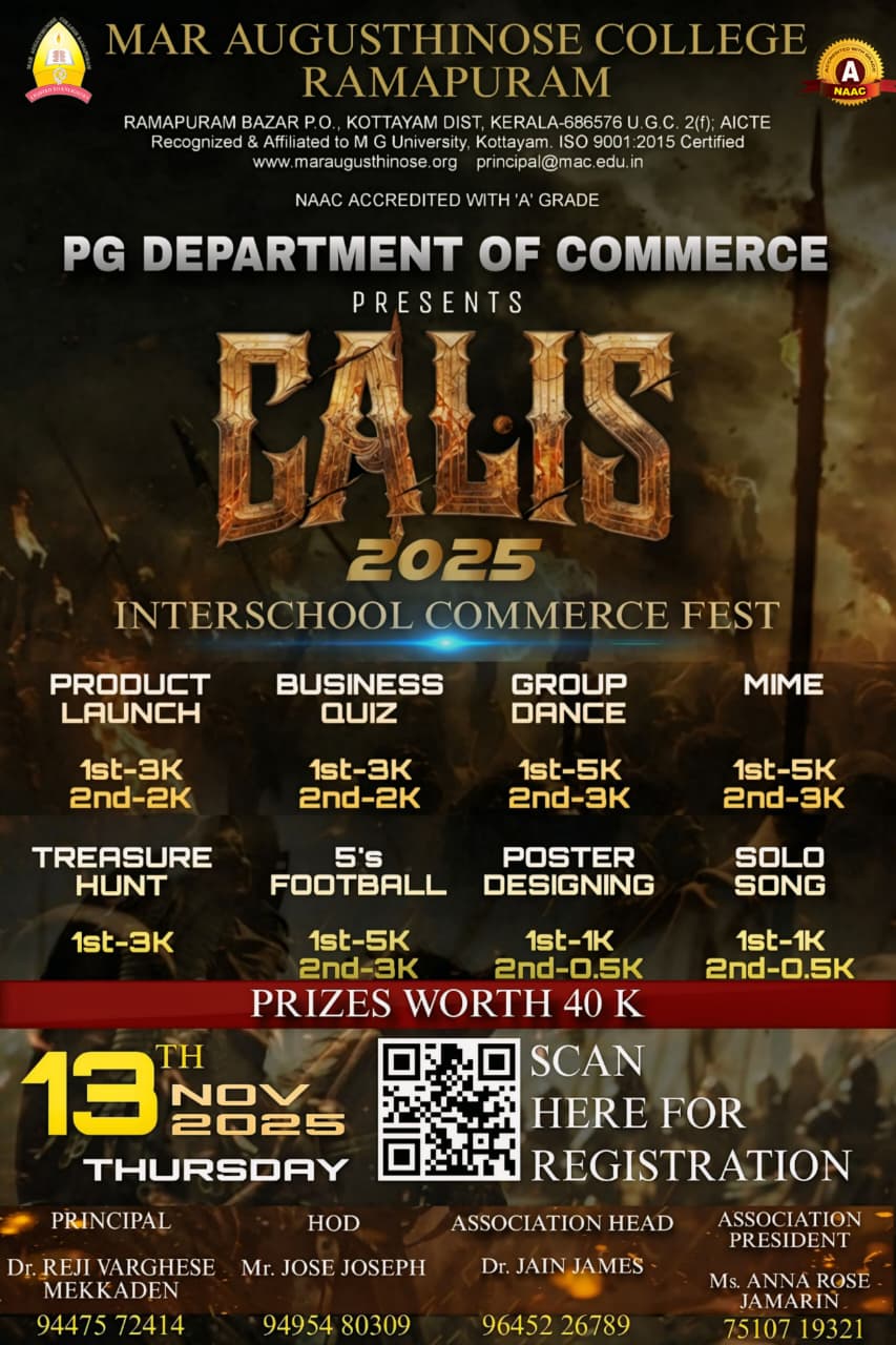 പാലാ /രാമപുരം : മാർ ആഗസ്റ്റിനോസ് കോളേജ് കോമേഴ്സ് ഡിപ്പാർട്മെന്റിന്റെ ആഭിമുഖ്യത്തിൽ ഹയർ സെക്കണ്ടറി വിദ്യാർത്ഥികൾക്കായി സംഘടിപ്പിക്കുന്ന കോമേഴ്സ് ഫെസ്റ്റ് ‘കാലിസ്’ നവംബർ 13 വ്യാഴം 10 ന് കോളേജ് ഓഡിറ്റോറിയത്തിൽ നടക്കും. ഫെസ്റ്റിനോട് അനുബന്ധിച് “ബിസിനസ് ക്വിസ്, പ്രോഡക്റ്റ് ലോഞ്ച്, ഫൈവ്സ് ഫുട്ബോൾ, ഗ്രൂപ്പ് ഡാൻസ്, മൈം, ട്രഷർ ഹണ്ട്, പോസ്റ്റർ ഡിസൈനിങ്, സോളോ സോങ് ” എന്നീ മത്സരങ്ങൾ നടത്തുന്നു .