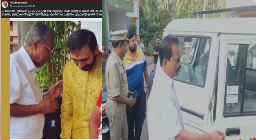 പിണറായി വിജയനും ഉണ്ണിക്കൃഷ്ണന് പോറ്റിയും തമ്മില് ഇത്രമേല് അഗാധമായ ബന്ധം ഉണ്ടാകാന് എന്തായിരിക്കും കാരണമെന്ന കാപ്ഷനോടെയാണ് ഇരുവരും ഒരുമിച്ചു നില്ക്കുന്ന ഫോട്ടോകള് കെപിസിസി രാഷ്ട്രീയകാര്യസമിതി അംഗവും കോഴിക്കോട് ജില്ലിയിലെ മുതിര്ന്ന നേതാവുമായ എന് സുബ്രമണ്യന് പോസ്റ്റിട്ടത്.