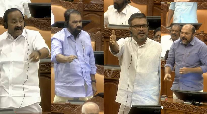 കെ എൻ ബാലഗോപാൽ, പി രാജീവ്, എം ബി രാജേഷ്, വീ ശിവൻകുട്ടി എന്നിവർ പ്രതിരോധവുമായി രംഗത്തെത്തിയത്. പ്രധാന സമ്മേളനത്തെ പ്രതിപക്ഷം തടസ്സപ്പെടുത്തുന്നുവെന്നും ബജറ്റ് ചർച്ച ചെയ്യാൻ പോലും പ്രതിപക്ഷം തയ്യാറാകുന്നില്ലെന്നും മന്ത്രിമാർ വിമർശിച്ചു. പ്രതിപക്ഷ നേതാവ് ആരെയും ചർച്ചയ്ക്ക് സമ്മതിക്കുന്നില്ല. ബജറ്റ് ചർച്ചയോടെ സഹകരിക്കാത്തത് ഇതാദ്യമാണ്. സോണിയ ഗാന്ധിയെ അപമാനിക്കാൻ പ്രതിപക്ഷം മനപ്പൂർവ്വം വിഷയങ്ങൾ ഉന്നയിക്കുകയാണെന്ന് ഭരണപക്ഷം വിമർശിച്ചു.