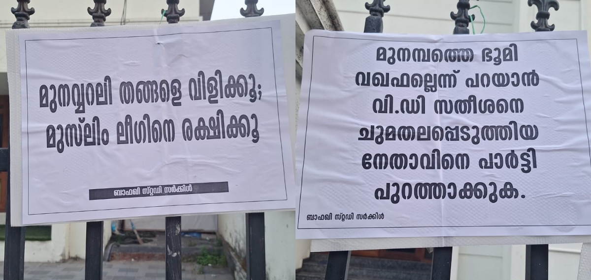 ‘മുനവ്വറലി തങ്ങളെ വിളിക്കൂ, മുസ്ലിം ലീഗിനെ ലക്ഷിക്കൂ’, ‘മുനമ്പത്തെ ഭൂമി വഖഫല്ലെന്ന് പറയാന് വി ഡി സതീശനെ ചുമതലപ്പെടുത്തിയ നേതാവിനെ പാര്ട്ടി പുറത്താക്കുക’, ‘ബിനാമി താല്പര്യങ്ങള് സംരക്ഷിക്കാന് ഫത്വ തേടി വരുന്ന രാഷ്ട്രീയക്കാരുടെ ചതിക്കുഴികള് പണ്ഡിതന്മാര് തിരിച്ചറിയുക’, എന്നിങ്ങനെയാണ് പോസ്റ്ററുകള്.
